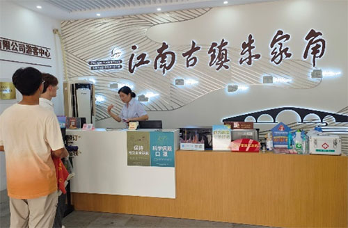 此圖為淮北師范大學歷史文化旅游學院長三角專項朱家角古鎮小組社會實踐團隊成員在游客中心與工作人員交流并了解朱家角古鎮的日常管理和如何打造5A級景區的圖片。通訊員 張鈺 供圖