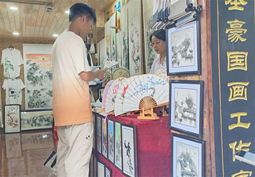 此圖為淮北師范大學歷史文化旅游學院長三角專項朱家角古鎮小組社會實踐團隊成員在古鎮景區內美術書法工作室,工作室負責人向團隊成員介紹朱家角古鎮獨有的古鎮文化和水文化。通訊員 張鈺 供圖