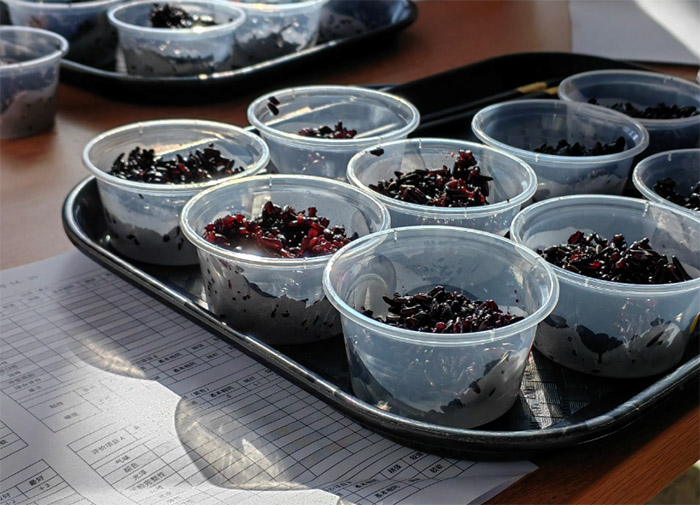 為進一步強化學習效果,第一黨支部精心準備了實踐“成果檢驗”環節——全谷物黑米品鑒會。現場擺放了包括“華墨香”在內的10份蒸煮完成的黑米品種,黨員們通過觀察色澤、聞取香氣、品嘗口感,直觀對比不同品種的差異。其中,“華墨香”黑米因顆粒分明、口感Q彈、回味甘甜、帶有淡淡米香等特點,成為現場口碑最佳的品種。第五黨支部的殷文晶同學在品鑒后分享道:“這次活動讓我對全谷物的認識不再停留在‘有營養’的模糊概念上,從知識科普到蒸煮方法,再到親口品嘗,每一步都很有收獲。尤其是‘華墨香’,比我之前吃過的黑米更好吃,以后肯定會把全谷物更多地放進日常飲食里。”