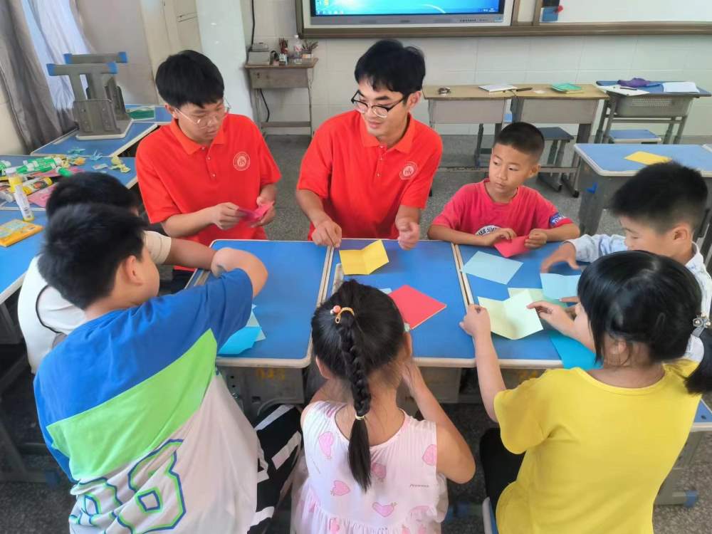 圖為蒲公英支教社會實踐團隊成員教孩子們折紙。