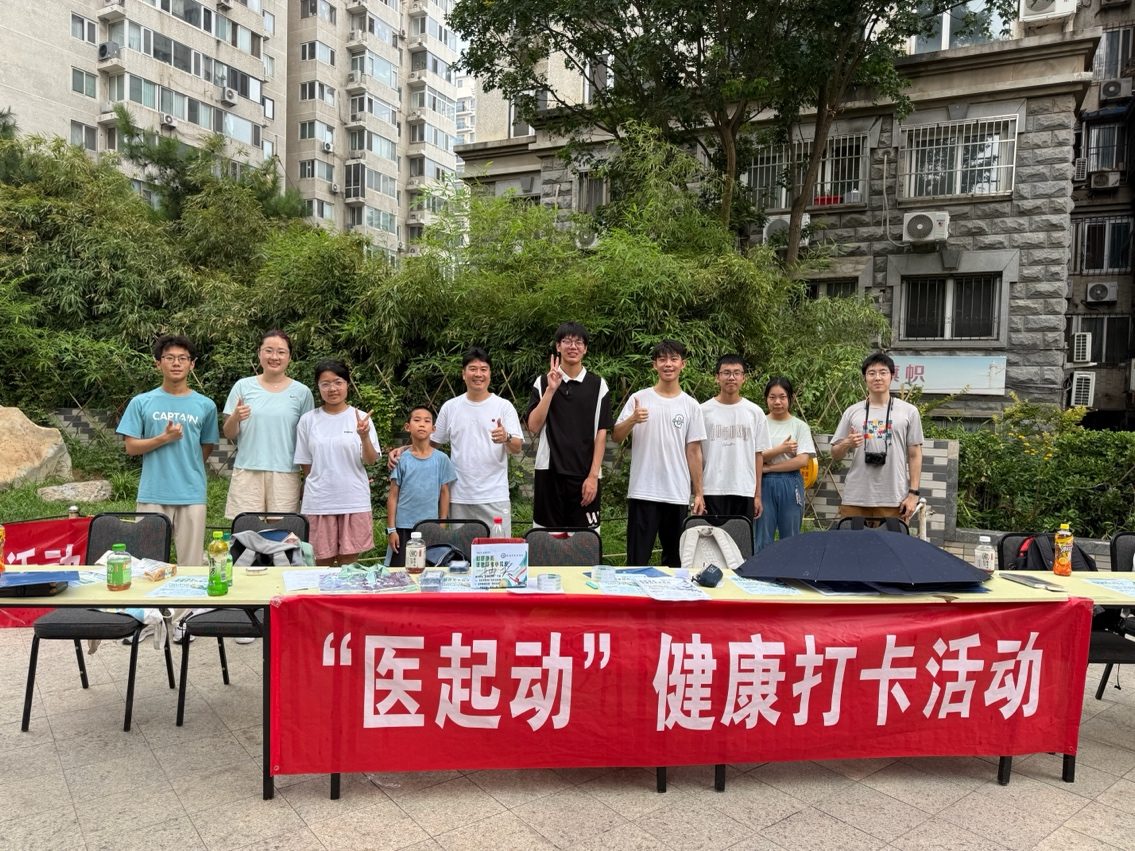 7月9日,隊員們前往海淀區萬壽路今日家園社區開設健康攤位,與居民們面對面探討社區居民健康生活方式規劃,了解社區健康基礎設施建設方面的居民需求,推廣團隊設計研發的微信健康打卡小程序,與居民們進行健康小游戲互動,和社區負責人反饋居民需求。