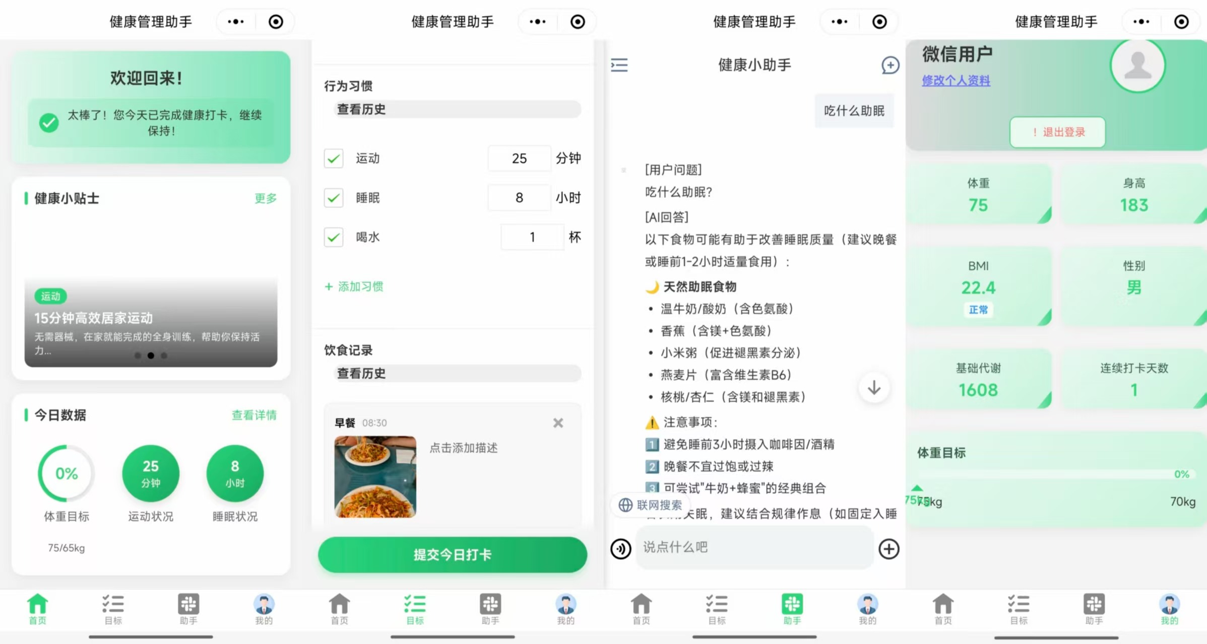 在進行實地考察的同時,實踐隊的隊員們也自主設計了健康管理小程序,幫助村民們以及需要健康管理輔助的人群進行有效的健康打卡、普及健康小貼士等。