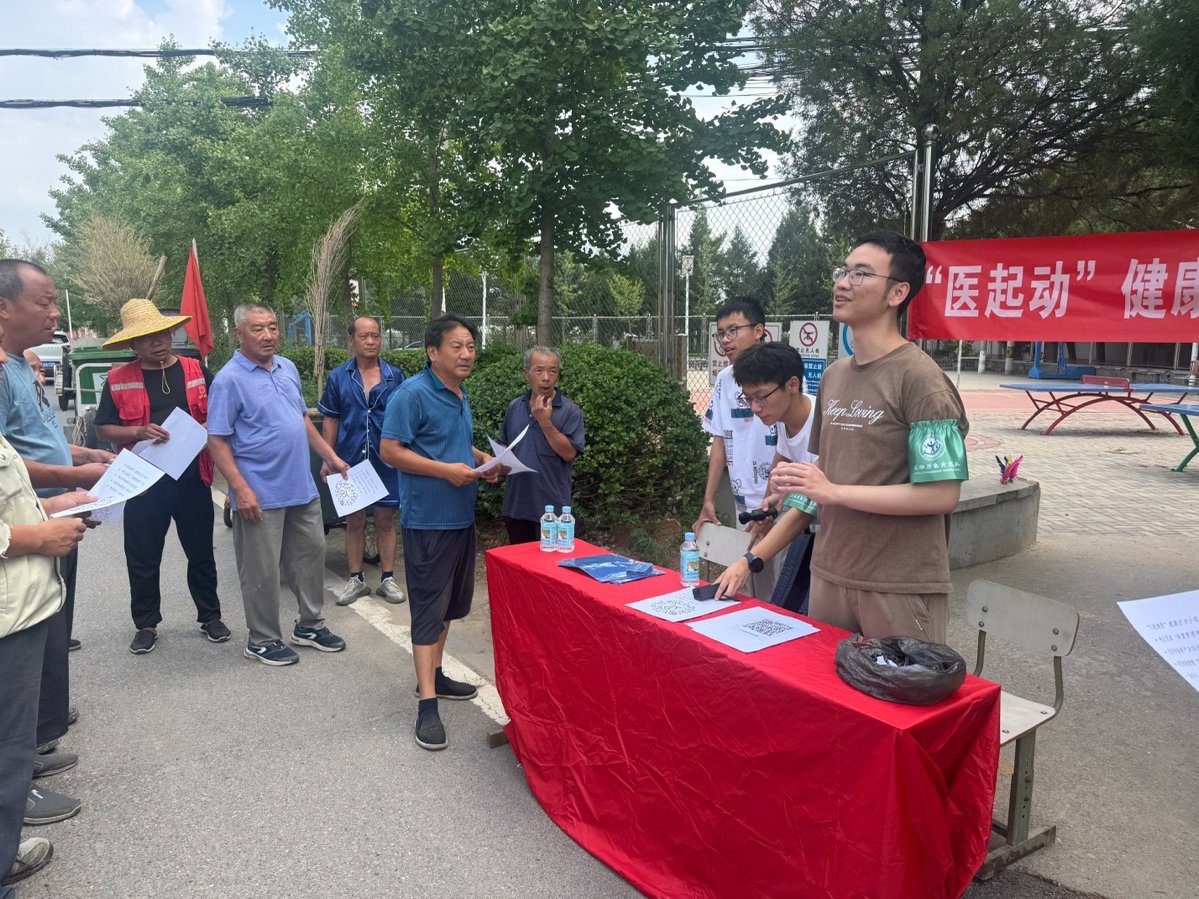 7月7日,隊員們來到順義區趙全營鎮稷山營村、前桑園村、東絳洲營村三地開設健康攤位,與村民們面對面探討村民健康生活方式規劃,聽取村民們的健康需求,推廣團隊設計研發的微信健康打卡小程序,與村民們一起進行健康小游戲互動。