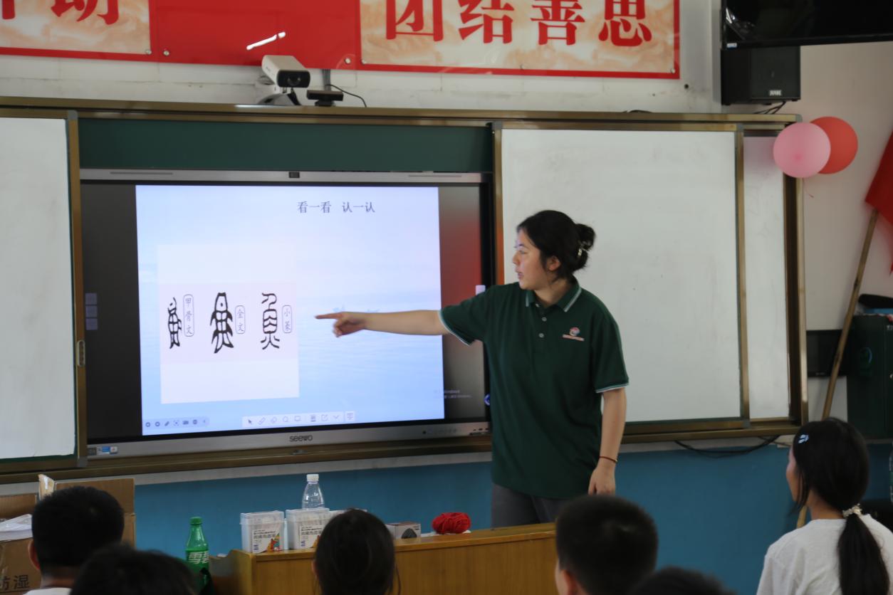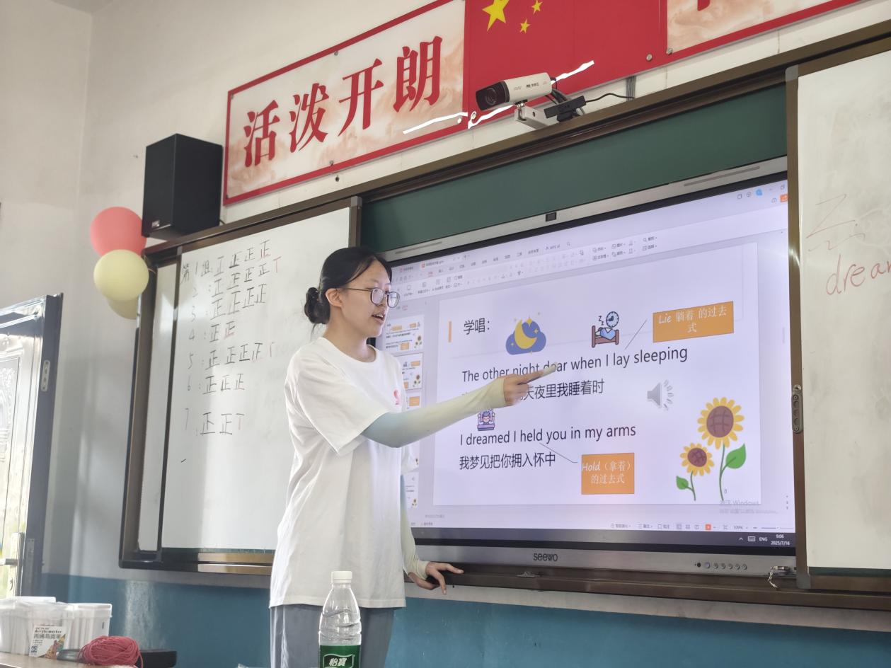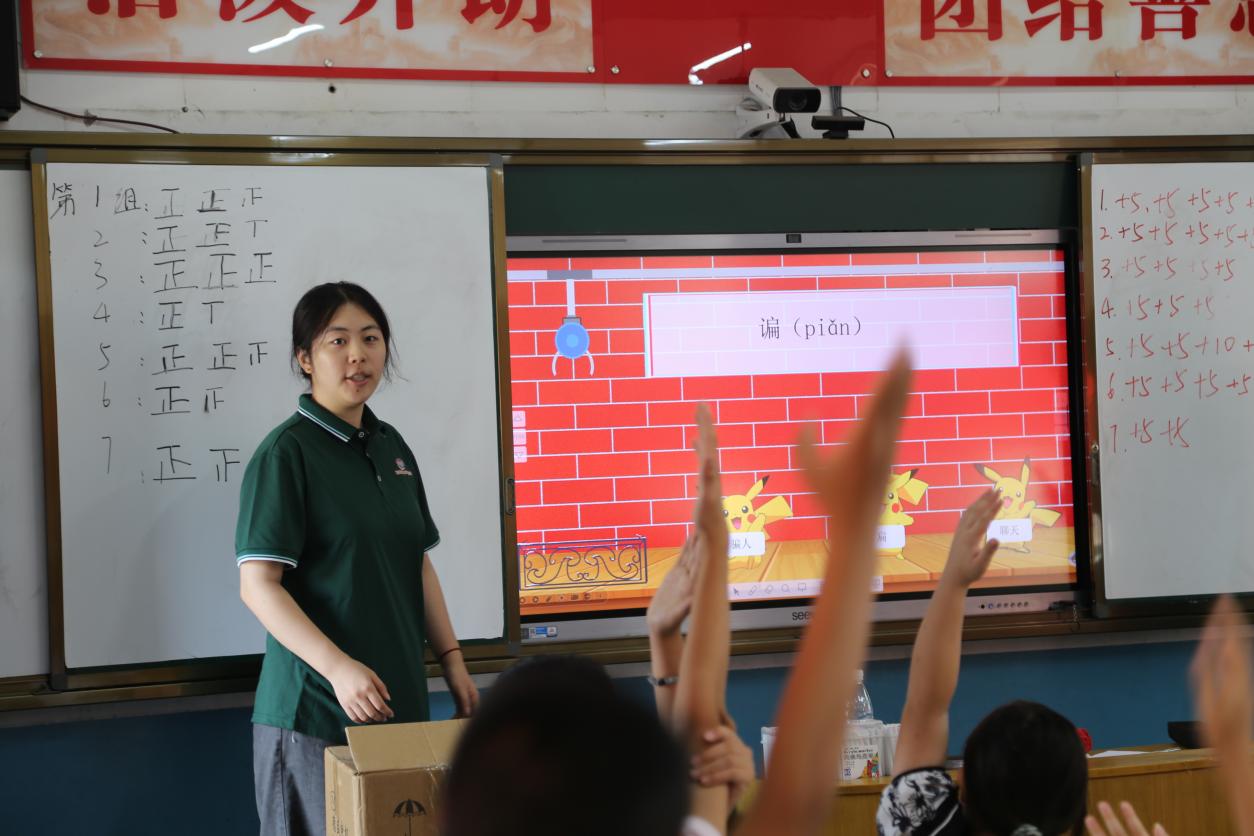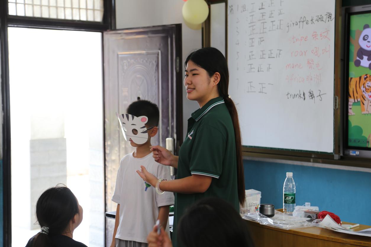 英語(yǔ)兒歌律動(dòng)課上,孩子們跟著志愿者拍手跺腳,在《youaremysunshine》的旋律里,英語(yǔ)變得不再陌生;動(dòng)物面具情景對(duì)話環(huán)節(jié),同學(xué)們戴著手工面具的“小獅子”“小兔子”用英語(yǔ)打招呼、猜謎語(yǔ)。團(tuán)隊(duì)志愿者通過(guò)營(yíng)造語(yǔ)言環(huán)境的方式,大大激發(fā)了同學(xué)們的學(xué)習(xí)興趣。