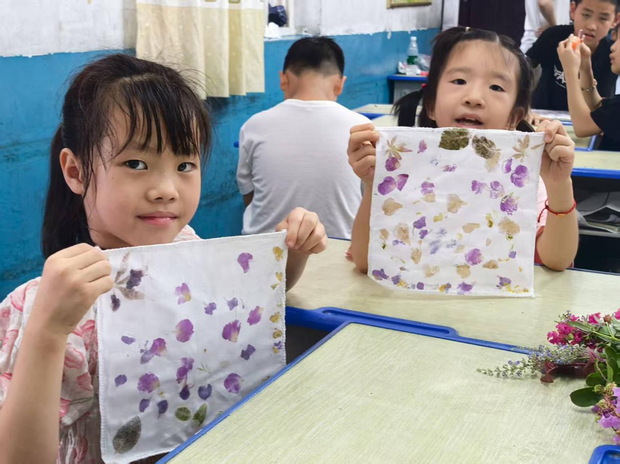 植物拓染課,孩子們跟隨老師用錘子輕敲葉片,把葉脈紋理“拓印”在布袋、手帕上,綠葉、黃花化作獨(dú)一無(wú)二的圖案,自然素材與藝術(shù)創(chuàng)意碰撞,誕生屬于自己的“自然藝術(shù)品”。
