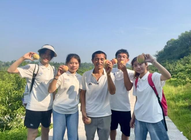 “家人們看過來,這是咱少云村的黃桃,味道非常美味!”在少云鎮黃桃園里,隊員員正手把手教農戶練習直播話術,調研中,他們聆聽產業業主關于 “普通話 + 電商” 的想法:“想把咱的黃桃賣到全國,得先說好通用話!” 希望通過說好普通話助力黃桃外銷全國,隊員們同步協助農場主調試設備、打磨話術。針對部分農戶因語言溝通阻礙對外合作與市場拓展的問題,實踐隊結合當地產業特色與紅色底蘊,設計出兩款特色推廣卡片,獲少云鎮邱書記肯定,邱書記還專門與卡片合影留念。