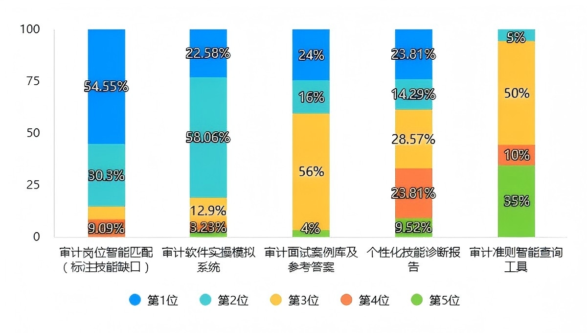 在AI工具的應用與需求方面,數據顯示:AI簡歷優化最受歡迎,在所有受訪者中,63.89%的人使用過AI工具進行簡歷優化,顯示出求職者對AI在簡歷提升方面的高度認可。根據調查結果,用戶最期待提供的服務功能是審計崗位智能匹配(標注技能缺口),以3.94的綜合得分位居首位,且有54.55%的受訪者將其排在第一位。受訪者所表現出的整體高度積極態度,共同勾勒出一個關鍵趨勢:AI已從輔助性工具快速演進為招聘生態中的核心賦能要素,其價值在效率提升(企業端)和競爭力增強(求職者端)兩個維度均獲得廣泛驗證,標志著該技術在人力資源領域正步入成熟應用期。