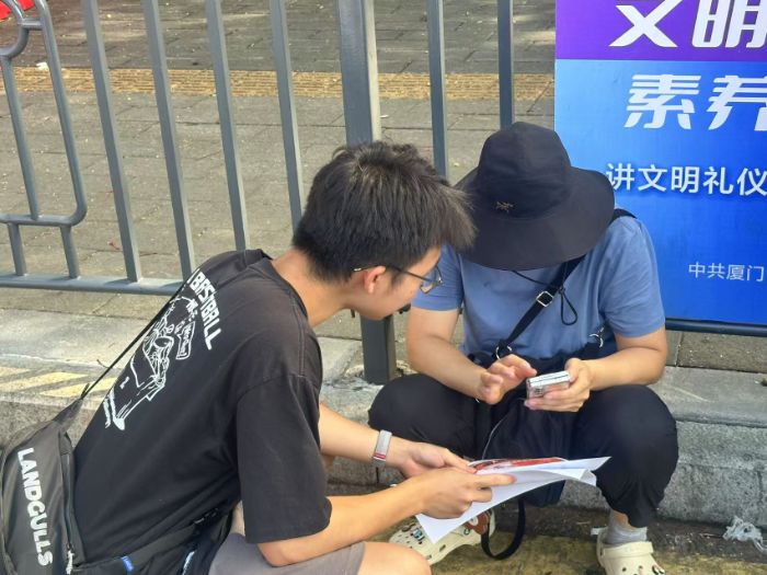 午后的廈大校門與黃昏的雙子塔觀景平臺,調研隊員敏銳捕捉著城市發展的生動注腳,成為一道流動的風景線。他們手拿提前準備好的問卷傳單,耐心邀請學生、商戶、游客、通勤族等多元群體參與問卷。大學生們熱烈討論著沙坡尾藝術展演帶來的文化滋養,新廈門人則更關注閩南古厝保護中彰顯的城市文脈。