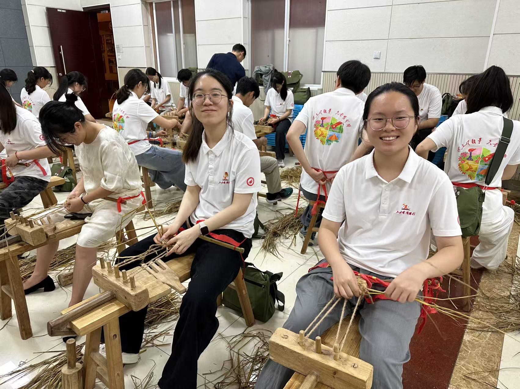 圖為團(tuán)隊成員做草鞋場景