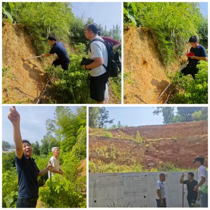 在李德營教授的帶領下,團隊聚焦具體地質災害風險區開展了詳細調查。上午,團隊前往天城鎮謝家坳村金阿姨家房屋切坡進行實地調查。李老師現場親自指導成員們進行調查工作,大家認真地調查邊坡形態、規模、坡度、斜坡結構、地層巖性、巖土體強度、邊坡變形等情況,繪制了工程地質剖面圖。同時,成員們還與村民親切交流,詳細詢問房屋的建設時間、經歷過的滑坡險情以及汛期邊坡變形特征,為分析切坡建房地質災害風險積累了寶貴的第一手數據。
