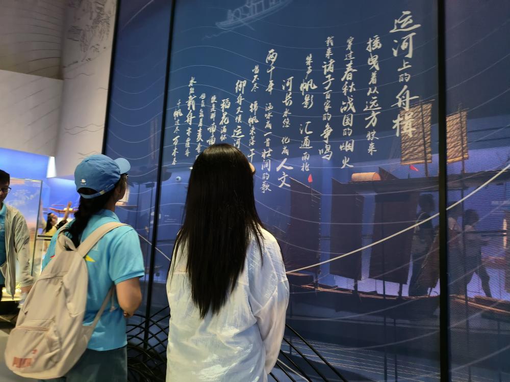提前預約后,小分隊進入中國大運河博物館進行參觀學習。館內展陳以大運河發展變遷為時間軸,以大運河全流域為空間范疇,細分為“大運河——中國的世界文化遺產”“運河上的舟楫”“因運而生——大運河街肆印象”3個常設展、“運河濕地尋趣”等6個專題展,以及“河之戀”數字化沉浸式展覽、展演傳統戲曲的小型劇場、青少年互動體驗項目和臨時展廳,通過生動有趣、可感可知的形式講好運河故事,讓小分隊成員了解到運河文物保護利用、運河遺產保護傳承、運河文化公園建設、大運河文化帶發展等。