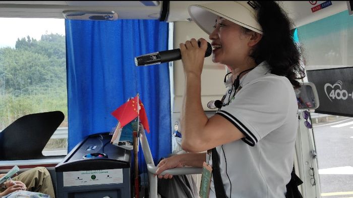 到了我們的觀光車上,志愿者拿起話筒,給大家詳細介紹各個景區(qū)景點,繪聲繪色的描繪著景區(qū)的美麗,并且耐心為大家解答疑惑。對于一些暈車或不適的游客,志愿者會無私的將自己的儲備物資拿出來提供給游客,安撫游客的同時并與調(diào)度中心進行溝通。