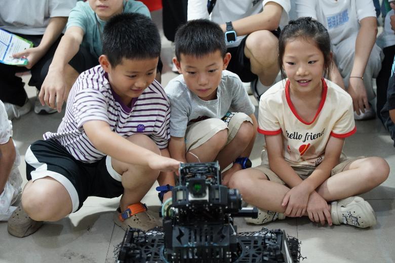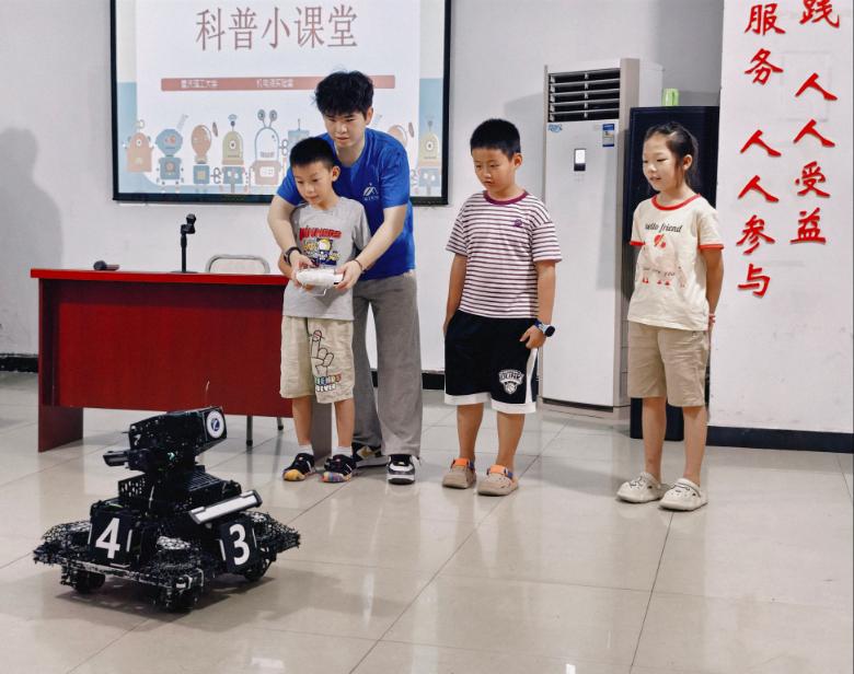 實(shí)踐團(tuán)成員不僅詳細(xì)講解了機(jī)器人的設(shè)計(jì)原理、技術(shù)亮點(diǎn)及其在國(guó)防、科研等領(lǐng)域的應(yīng)用前景,更將科技的魅力化為可觸可感的互動(dòng)體驗(yàn)。小朋友們圍在機(jī)器人周?chē)诖髮W(xué)生哥哥姐姐手把手的指導(dǎo)下,親自操縱機(jī)器人完成移動(dòng)、旋轉(zhuǎn)、發(fā)射等動(dòng)作。當(dāng)機(jī)器人靈活地執(zhí)行著指令,孩子們臉上綻放出驚喜與自豪的笑容,指尖操控的不僅是一臺(tái)機(jī)器,更是對(duì)科技奧秘的好奇與對(duì)創(chuàng)新未來(lái)的無(wú)限憧憬。