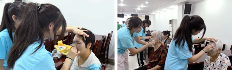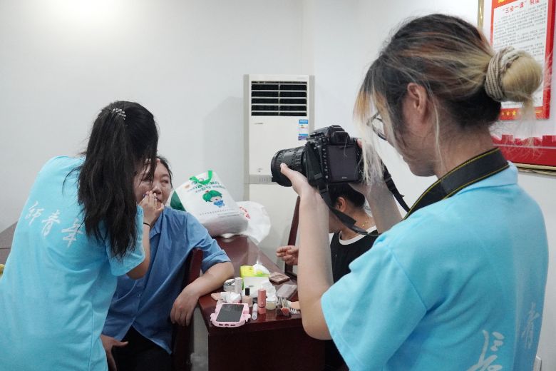 志愿者協助老人挑選自己心儀的服裝,并根據服飾特點設計妝容及發型。在志愿者的聲聲夸贊中,老人們逐漸放松,嘗試更多年輕人的拍照姿勢。