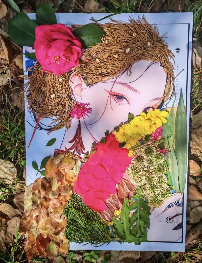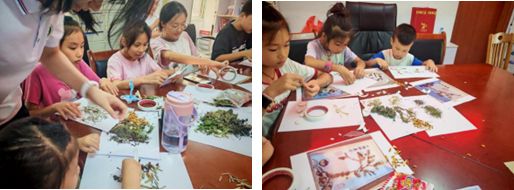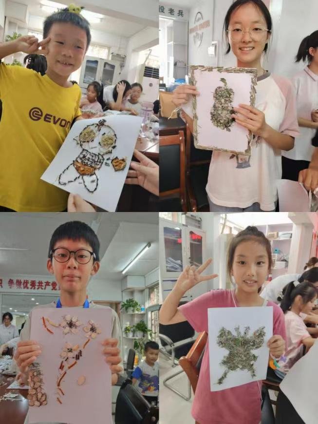 孩子們化身小藝術家,以白紙為底,以藥材為筆,指尖靈動。輕捻紫蘇勾勒線條,撒開艾草渲染底色,菖蒲與丁香錯落成景。天然的植物形態與孩子們的奇思妙想相映成趣,既保留了中藥材的原始質感,又注入了童真的創意活力。