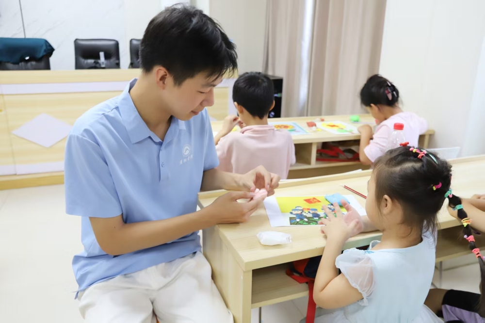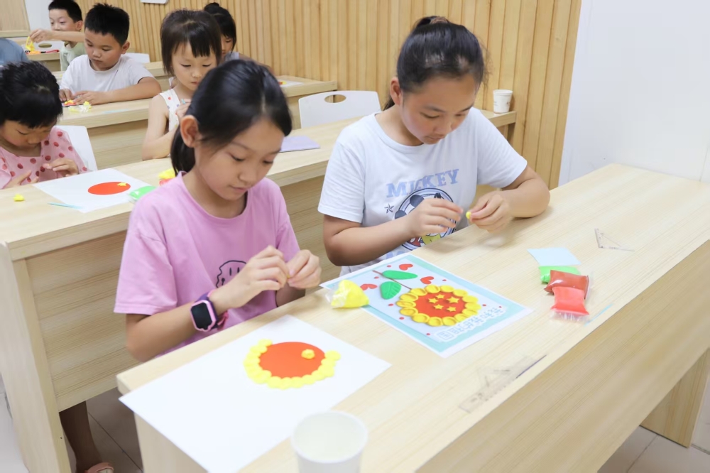 活動現場,志愿者尹子禎以一組精美的黏土成品拉開課堂序幕:“向日葵永遠向著陽光,就像我們永遠心向祖國;黨旗上的鐮刀錘頭,是先輩們奮斗的印記;紅軍戰士的軍帽五角星,是守護人民的信仰……”童趣化的語言瞬間點燃孩子們的興趣。在分步驟講解制作技巧后,志愿者按小組分發黏土、工具,與孩子們共同開啟創作之旅。