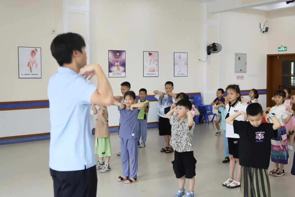 活動伊始,志愿者劉潤東帶領孩子們進行熱身運動。通過“頭部繞環、擴胸運動、弓步壓腿”等動作示范,他以生動口令引導孩子們舒展四肢。起初略顯拘謹的孩子們在志愿者細致調整姿勢與“真棒”“加油”的鼓勵聲中逐漸放松,稚嫩的動作里透露出專注與認真,現場歡聲笑語交織成一片活力氛圍。