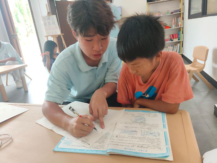 快樂不忘學業。針對暑假作業中的難點,隊員們提供耐心的一對一輔導。面對數學的邏輯迷宮、語文的閱讀難點或英語的語法困惑,他們運用清晰標準的普通話,借助畫圖、舉例、分步推導等方法,將抽象知識轉化為孩子們易于理解的“通關秘籍”。筆尖沙沙作響,輕聲問答交流,共同譜寫著夏日里動人的學習樂章。