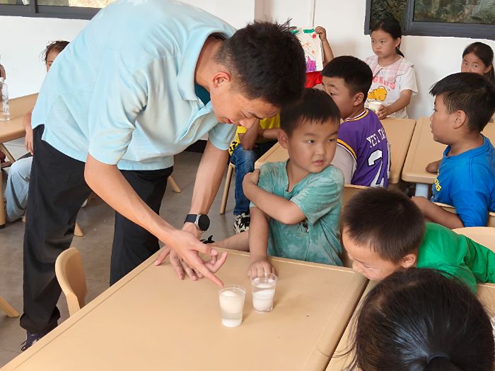“會游泳的雞蛋”、“愛跳舞的泡泡”……一個個奇妙的小實驗引發陣陣驚嘆!“青為”隊員們化身為科學引路人,用普通話生動講解實驗原理,以趣味實驗為鑰匙,為孩子們開啟科學知識的大門,讓探索的樂趣在課堂綻放光芒。