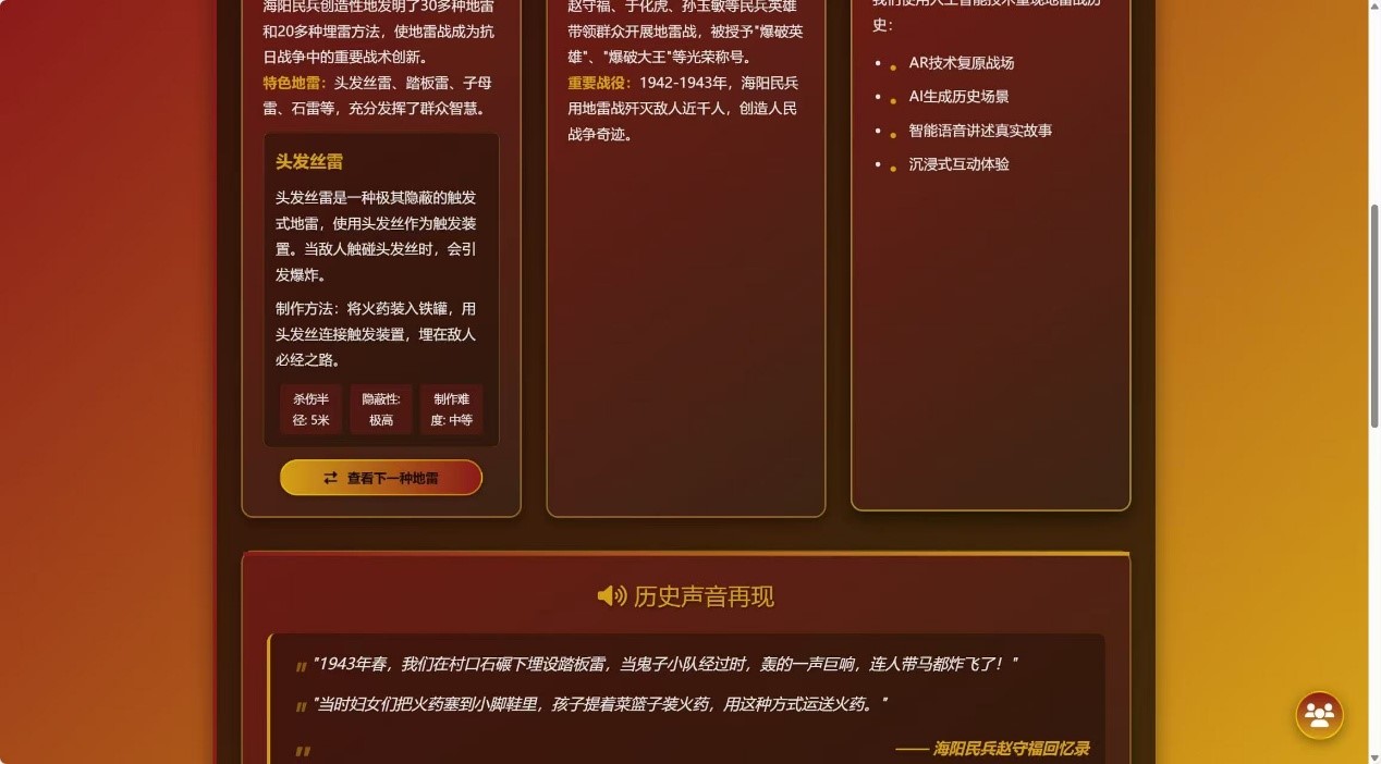 此外,“歷史聲音再現(xiàn)”收錄民兵講述,“AI戰(zhàn)爭詩歌”自動生成并誦讀,從聽覺、文學維度拓寬傳承路徑,以科技為筆,讓地雷戰(zhàn)精神在新時代書寫更生動的傳承篇章,讓紅色歷史突破時空局限,持續(xù)照亮當下與未來 。