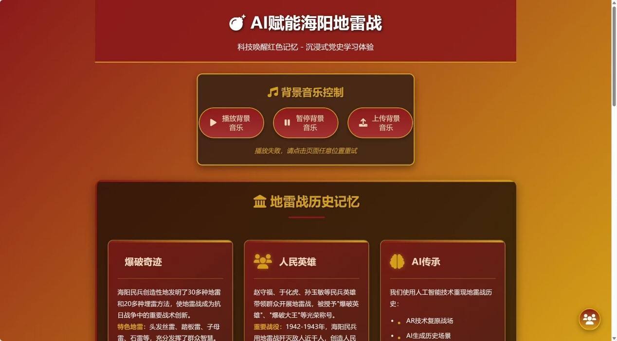 從紀念館返程,實踐團便錨定“AI賦能紅色傳承”方向全力攻堅。歷經(jīng)日夜打磨,8月上旬,“AI賦能海陽地雷戰(zhàn)”主題網(wǎng)頁正式上線。進入網(wǎng)頁,背景音樂模塊靈動可控,播放、暫停、自定義上傳,用旋律為歷史敘事鋪陳沉浸底色;“地雷戰(zhàn)歷史記憶”板塊,“爆破奇跡”細數(shù)30余種地雷、20多類埋雷技法的創(chuàng)新火花,“人民英雄”深情鐫刻趙守福等先烈事跡,讓沉睡史料“活”成可感可知的立體故事 。
